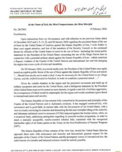 وأشارت في الرسالة إلى أنه وفي هذا السياق، تدعو جمهورية إيران الإسلامية الأمم المتحدة وجميع أعضاء مجلس الأمن بما يتفق مع المسؤولية الأساسية للمجلس بموجب ميثاق الأمم المتحدة عن صون السلم والأمن الدوليين، إلى الاستخدام الكامل لسلطة المجلس ومساعيه الحميدة لضمان أن تكف الولايات المتحدة فورا عن تهديداتها غير المشروعة باستخدام القوة، وأن تمتثل لالتزاماتها بموجب الميثاق ولا سيما المادة 2 (4)، وأن تمتنع عن أي عمل من شأنه أن يزيد من تصعيد التوترات أو يؤدي إلى مواجهة عسكرية، والتي ستكون عواقبها وخيمة وبعيدة المدى على السلم والأمن الإقليميين والدوليين.