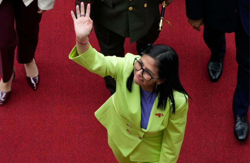 وفي الخامس من يناير، أدت رودريغيز اليمين الدستورية لتولي رئاسة المرحلة الانتقالية. وكانت تُعد حتى ذلك الوقت من أكثر الشخصيات قربًا وولاءً لمادورو، حيث أدانت إلقاء القبض عليه من جانب الولايات المتحدة، واعتبرت ما جرى خرقًا واضحًا لقواعد القانون الدولي.