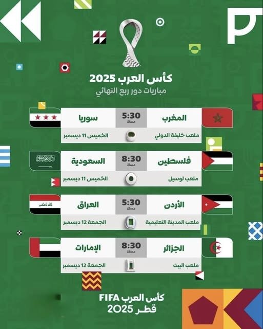 ويستعرض الإنفوغرافيك المرفق جدول مباريات الدور ربع النهائي لبطولة كأس العرب 2025؛ إذ يلتقي في المواجهة الأولى منتخبا المغرب وسوريا بتوقيت 30:5 مساء، تليها مواجهة فلسطين أمام السعودية بتوقيت 30:8يوم الخميس 11 ديسمبر .