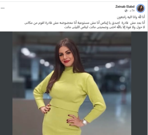 أُعلنت خبر رحيل الفنانة الشابة إيناس الليثي. من خلال الحساب الشخصي للفنانة زينب العبد على موقع فيسبوك. حيث كتبت كلمات مؤثرة عبر من خلالها عن صدمة كبيرة وحالة من عدم التصديق.