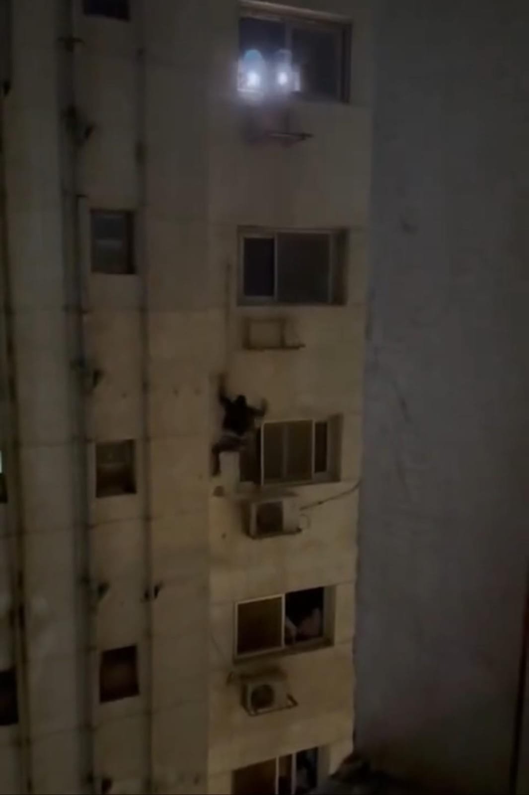 الفيديو أظهر المتهم وهو ينتقل بين الطوابق واقفًا على أجهزة التكييف، محاولًا النزول من الدور العاشر إلى التاسع، بينما كان الأهالي في الأسفل لا يصرخون خوفًا على ممتلكاتهم… بل خوفًا عليه! «خلي بالك تقع!» «ادخل الشقة من الشباك!» «يا رب تنزل بخير!»