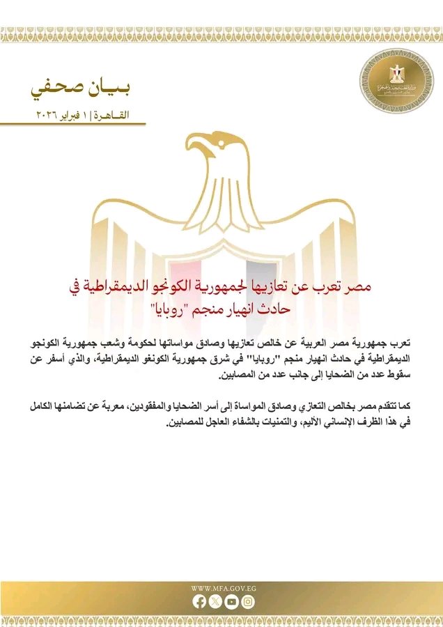 تقدّم جمهورية مصر العربية خالص التعازي وصادق المواساة لحكومة وشعب جمهورية الكونغو الديمقراطية، إثر حادث انهيار منجم “روبايا” في شرق البلاد، والذي أسفر عن سقوط عدد من الضحايا ووقوع إصابات بين العمال والمواطنين في المنطقة المحيطة. يأتي هذا الحادث المؤلم في وقت تتضافر فيه الجهود الإنسانية لإنقاذ المفقودين وتقديم الدعم الطبي العاجل للمتضررين.