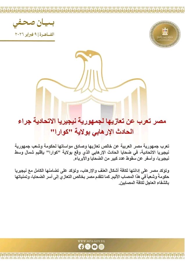 أعربت جمهورية مصر العربية عن بالغ حزنها وتعازيها العميقة لحكومة وشعب جمهورية نيجيريا الاتحادية، إثر الحادث الإرهابي المأساوي الذي وقع في ولاية “كوارا” بمنطقة شمال وسط نيجيريا، وأسفر عن سقوط العديد من الضحايا الأبرياء.