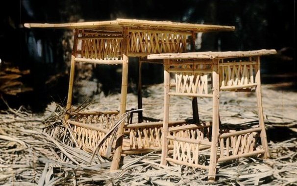 ثم يتم قص الجريد إلي مقاسات وتخرم بفتحات لتثبيت الأعمدة.